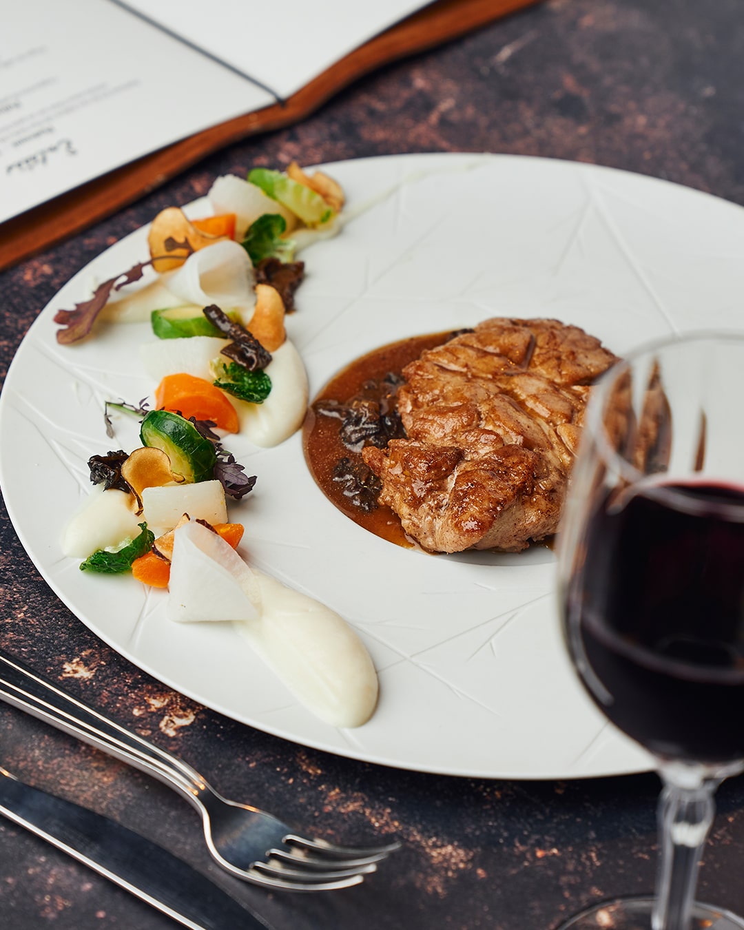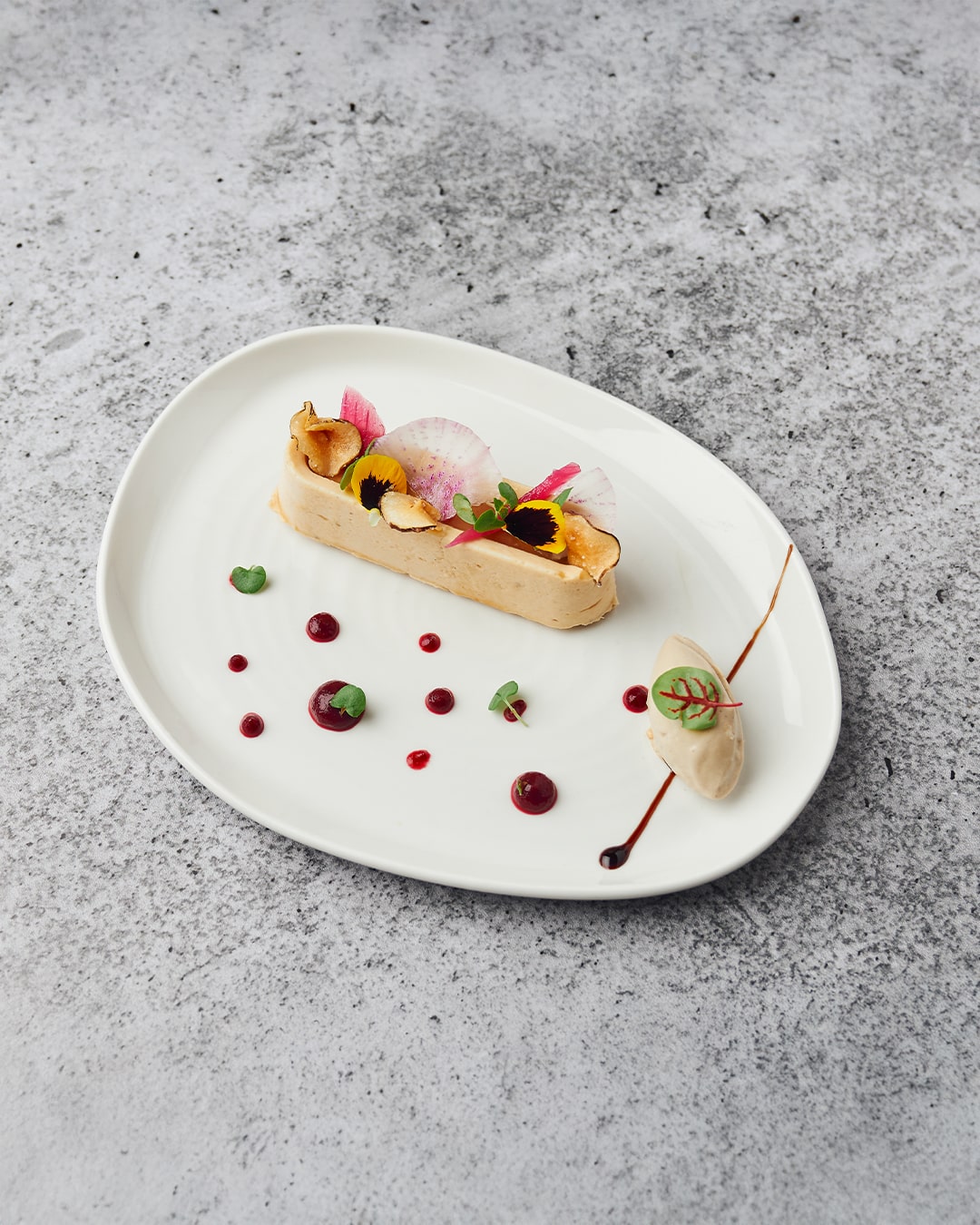 Finger de caille aux morilles et volaille d’Auvergne, gel de betterave rouge, glace aux cèpes et vinaigrette à l’huile de noisette