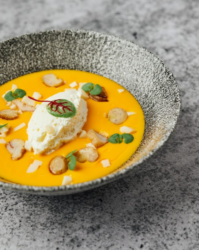 Cappucino de potimarron, brunoise de scamorza fumée et éclats de châtaignes