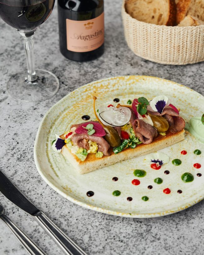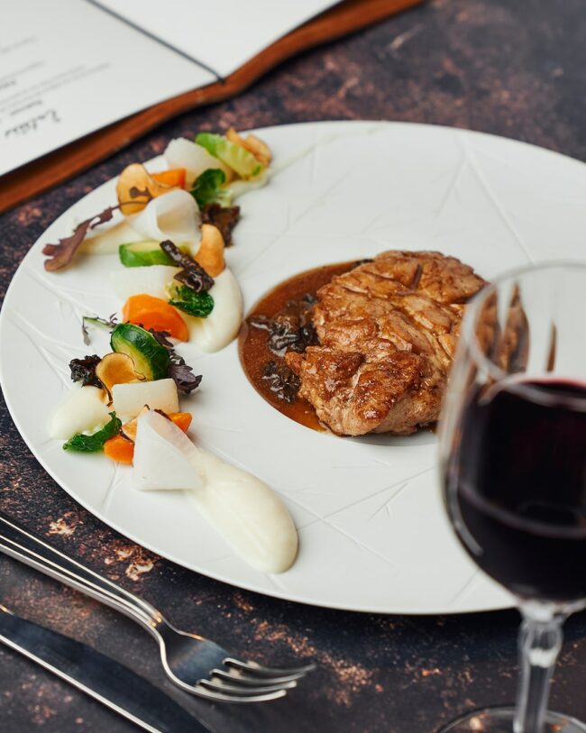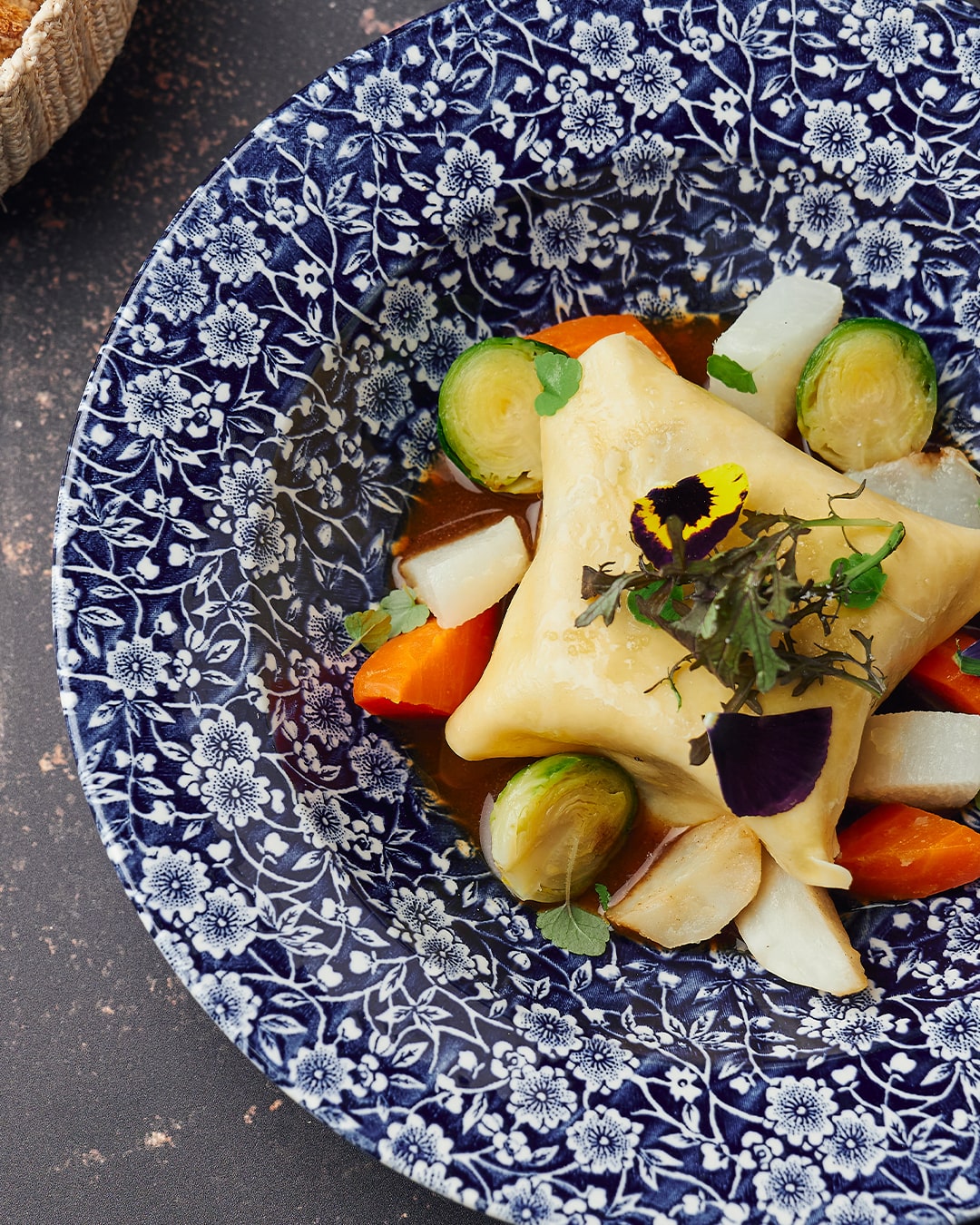 Raviole ouverte à la joue de boeuf confite pendant 12 heures à basse température et légumes d’hiver au beurre persillé