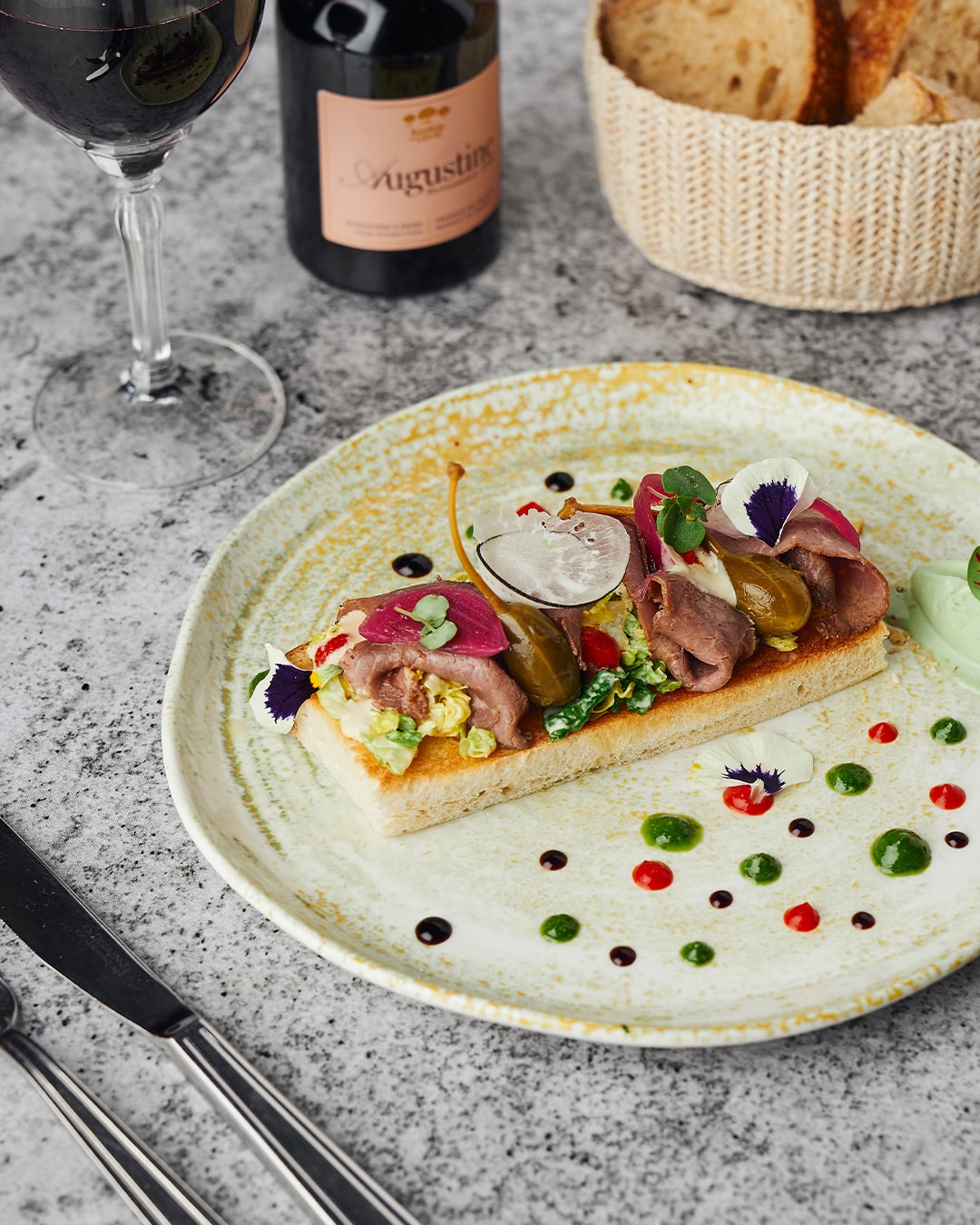 Pastrami 2.0 de race Aubrac (de New York à Riom), pickles d’oignons rouges, radis noir, sucrine sauce César sur un pain brioché toasté et crème glacée au wasabi