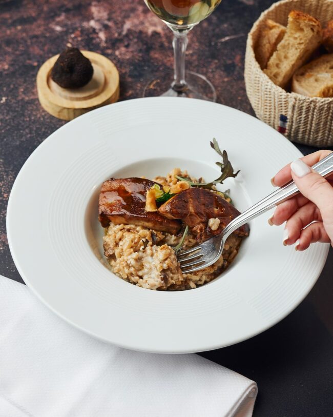 Risotto Carnaroli aux cèpes d’Auvergne et truffes du Périgord, escalope de foie gras chaud poêlée et jus de viande corsé