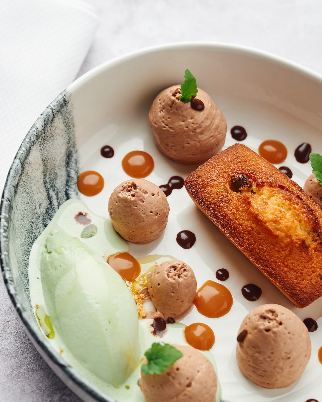 Financier aux éclats de pistache, Namelaka au chocolat du Cameroun, glace à la pistache et huile d’olive