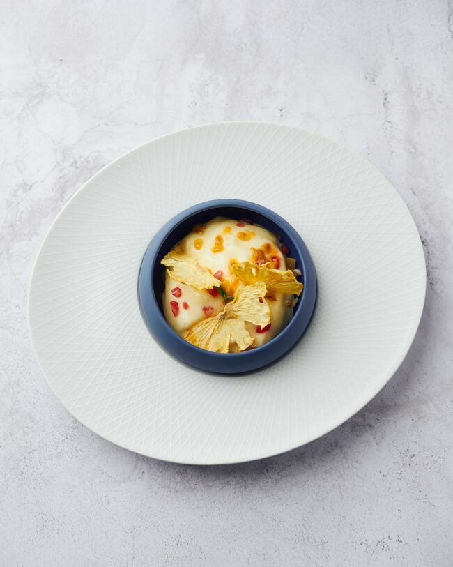 Brunoise d’ananas caramélisé et flambé au rhum, sorbet coco, siphon d’ananas et fruit de la passion